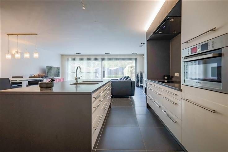De keuken beschikt achteraan over een deur verwerkt in de keuken die toegang geeft tot een bureau ruimte of berging.