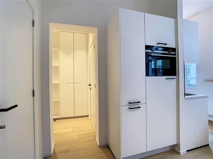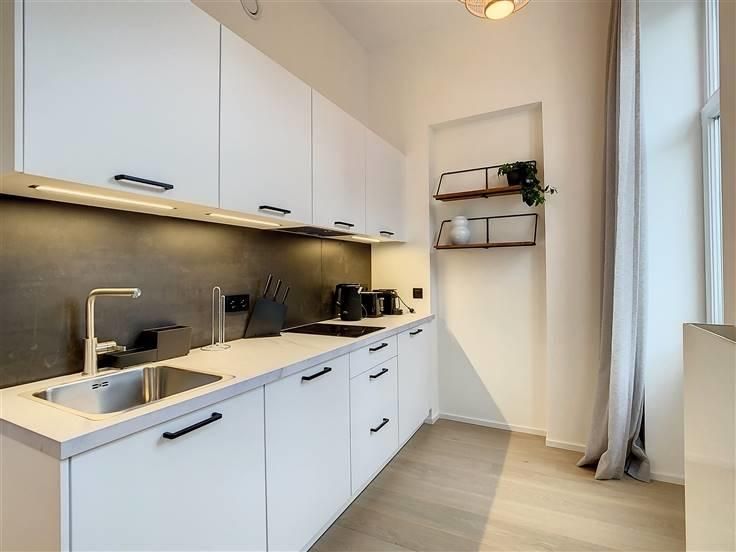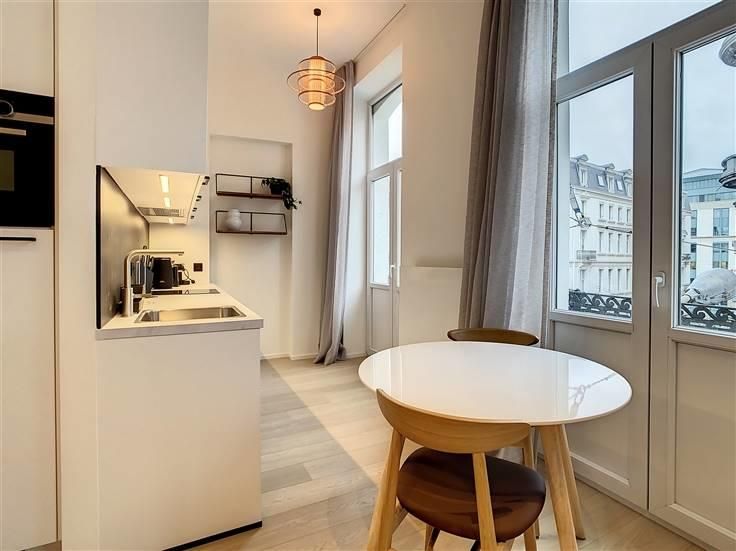 Quartier du Marais, entre la Place de Brouckère et Rogier, agréable appartement meublé de ±65 m² entièrement rénové en 2023 situé au 3ème étage d'un bel immeuble au début de la zone piétonne, à deux pas du centre ville, de la Grand Place, Place Sainte-Catherine, Dansaert, et entouré de nombreux commerces, restaurants, cinémas et transports (tram, bus, train, métro) accessibles à pied. Il se compose d'un hall d'entrée avec placards et un WC séparé, un séjour de ±25 m², une cuisine super équipée (four, plaque de cuisson, hotte, réfrigérateur, congélateur, lave-vaisselle) avec accès au balcon, une chambre de ±15 m², une salle d'eau (douche, lavabo). Parquet partout, double vitrage. Points forts : excellente situation, mobilier design, luminosité, construction de qualité.