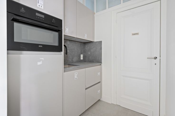 Bij aankomst kan u dit impressionant pand betreden via de aparte ingang aan de rechterkant van het gebouw. Dit kantoor bestaat uit twee aparte ruimtes, een kitchenette en een apart toilet. De kitchenette is voorzien van een combi-oven van AEG, Quookerkraan en koelkast met vriesvak. Vanuit deze ruimte is er nog toegang tot de gemeenschappelijke gang.