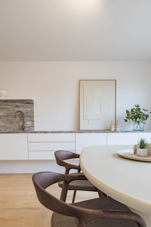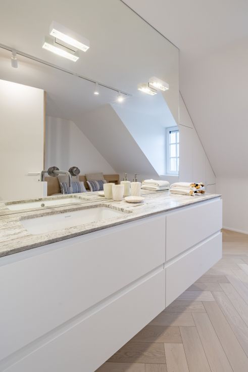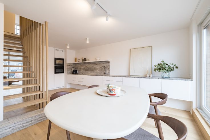 Licht en ruim penthouse met twee grote terrassen. Perfect voor 6 personen. Het werd volledig gerenoveerd met hoogwaardige materialen en een verfijnd, eigentijds design. Dit lichtrijke penthouse bestaat uit: • Een woonkamer met op maat gemaakte kasten in notenhout, die via grote schuiframen uitgeeft op een prachtig voorterras • De leefruimte kan ook dienen als derde slaapkamer en geniet van een aangrenzende douchekamer. Een metalen/glazen deur scheidt deze van de rest van het penthouse en maakt er een aparte unit van • Gastentoilet • Hedendaagse keuken met hoogwaardige Miele-apparatuur (vaatwasser, oven, wijnkoelkast, etc.) en een prachtig werkblad in travertin natuursteen • Eethoek die uitgeeft op een terras dat in de namiddag en avondzon baadt • Twee ruime slaapkamers met ingebouwde kasten, elk met een eigen badkamer met een Mortex-douche en een dubbel badkamermeubel met travertin natuurstenen blad • 2 toiletten • Privékelder • Fietsenstalling Het penthouse is ideaal gelegen, vlak bij winkels.