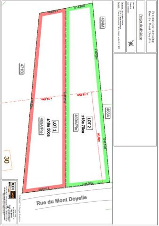 Le lot N°2 a une superficie totale de 18a70ca avec une largeur de façade de 24m (repris sous teinte verte au plan de géomètre): prix indicatif : 99.000€.