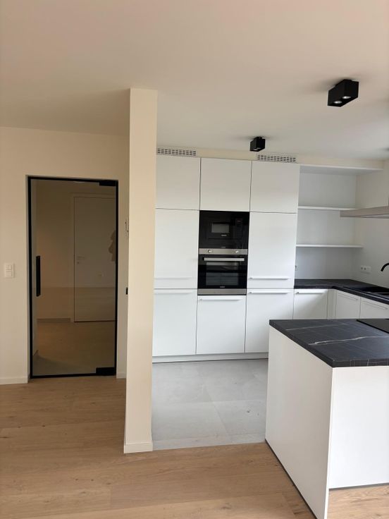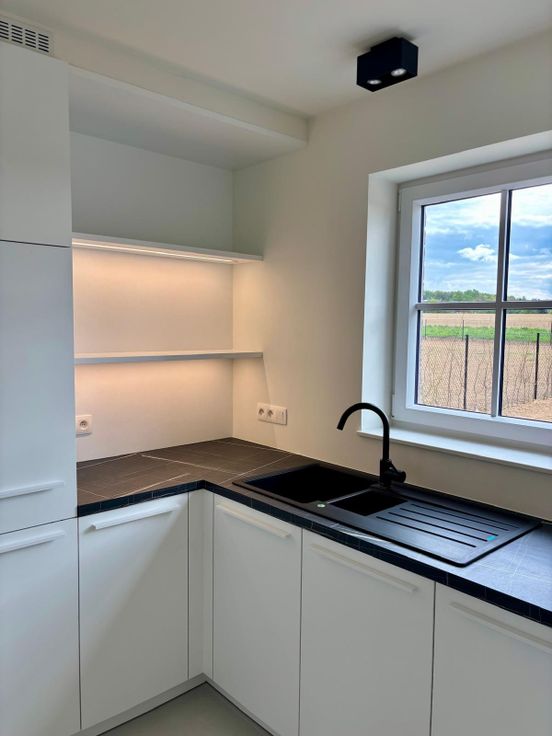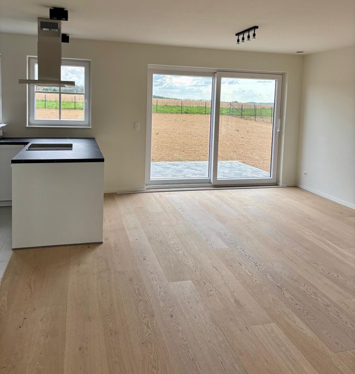 Au rez : hall (avec placard vestiaire), wc, buanderie, cuisine ouverte sur la salle-à-manger, living avec accès terrasse et jardin.