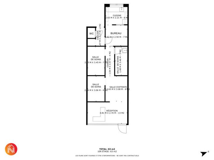 Il se compose d’un espace d’accueil chaleureux de 21 m², de trois salles de soins, d’un bureau, d’une cuisine et d’un WC indépendant.