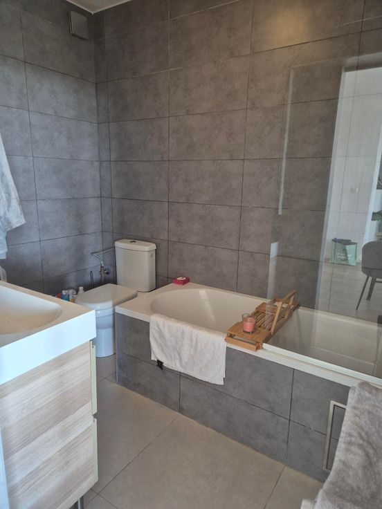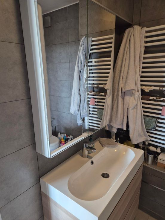 De badkamer bevindt zich naast de leefruimte en is voorzien van een comfortabele douche-bad combinatie, een moderne wastafel en een wc.