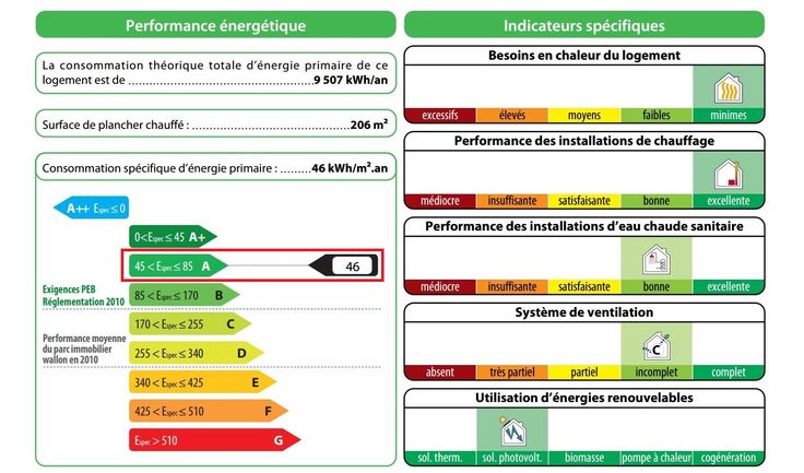 Le bien dispose d’un certificat PEB A, d’une installation photovoltaïque de 6,5KW, d'une citerne d’eau de pluie de 7500 litres qui alimente les WC, la machine à laver et le robinet extérieur, d’une chaudière au gaz basse température, chauffage au sol et d’une alarme.