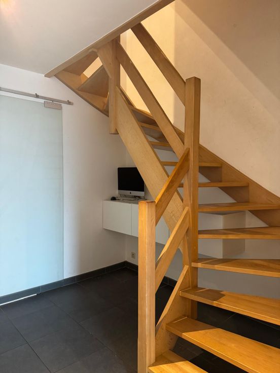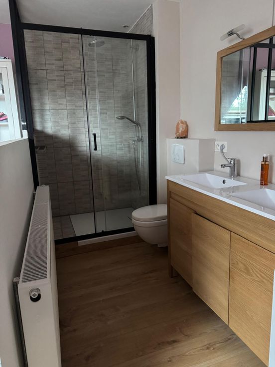 Au rez-de-chaussée, vous serez accueilli par un grand hall d’entrée avec un WC invité. Un garage pratique est accessible directement. L’espace de vie spacieux de 40 m² comprend un salon lumineux et une cuisine équipée ouverte, donnant sur une jolie terrasse exposée sud-est, idéale pour profiter des beaux jours. Un petit espace de rangement complète ce niveau.