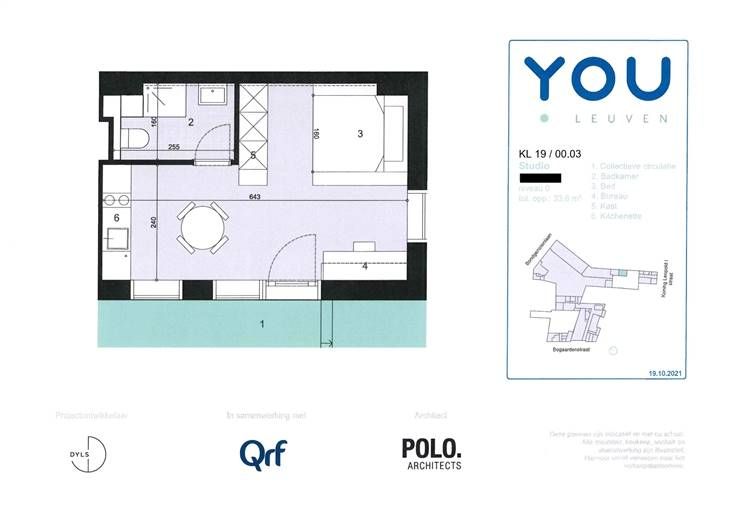 * Bezoek aan te vragen via student@immolivit.be ** Alleen voor studenten Project YOU bevindt zich op de Bondgenotenlaan, de belangrijkste en meest gekende winkel-wandelstraat van Leuven. Met zijn drie ingangen en strategische ligging onder de toren van de universiteitsbibliotheek is het project dé nieuwe hotspot voor studenten in Leuven. Dankzij de ligging langs de belangrijke toegangsweg van de stad is YOU vlot bereikbaar, zowel te voet, met de fiets als met het openbaar vervoer en de wagen. De dichtstbijzijnde bushalte bevindt zich op één minuut, het treinstation op slechts tien minuten. De gebouwen zijn voorzien van alle comfort en uitgebreide eigentijdse faciliteiten, en de groene binnen gebieden bieden ruimte voor een aangename break in het levendige Leuvense studentenleven. Deze Studio is gelegen aan de achterkant van residentie YOU met toegang via de Koning Leopold I straat. De studio bevindt zich op de gelijkvloerse verdieping met mooi zicht op de aanplantingen van de binnentuin. Hierdoor is er veel natuurlijke lichtinval en is er uitzicht op de beplante binnentuin. De studio beschikt over een eigen badkamer met wastafel, douche, en toilet. De studio is ook uitgerust met een eigen keuken voorzien van de nodige toestellen zoals een inductievuur, dampkap, ingebouwde koelkast en ingebouwde microgolf/oven. Ondergronds is er een afsluitbare fietsenstalling en een afvallokaal. De prijs is 1045 euro/maand exclusief provisie nutsvoorzienin