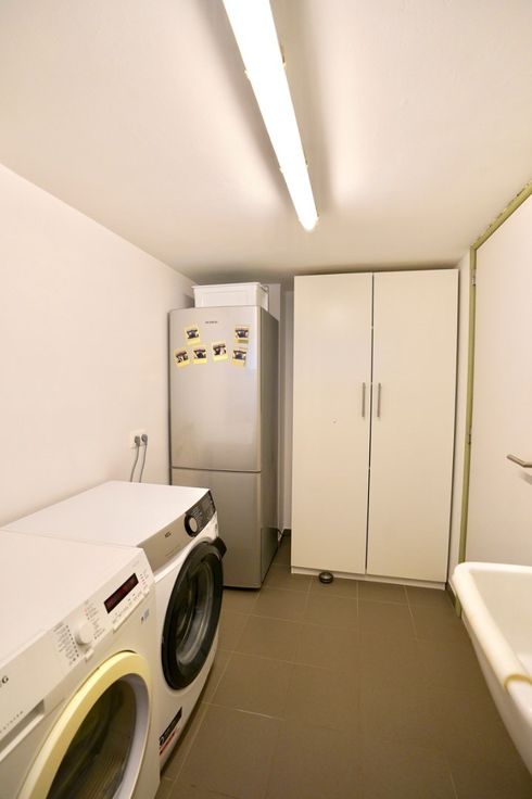 Gelijkvloers: inpandige garage met ingemaakte kasten, wasplaats met toilet, leefveranda met aansluitend de zonnige tuin met terras en prachtig uitzicht achteraan !
