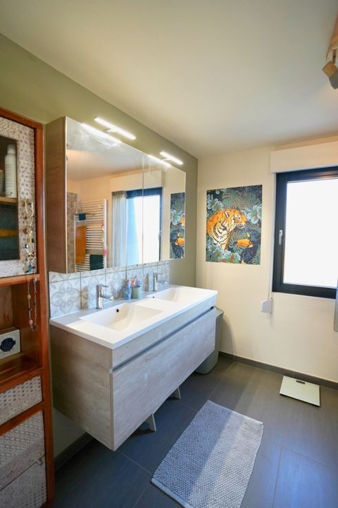 2de verdieping: nachthal, 3 slaapkamers, berging en de badkamer met dubbele lavabo en bad/douche combinatie.