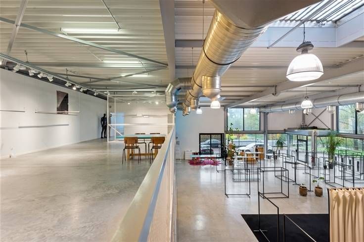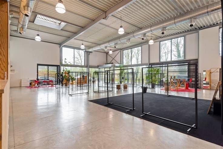 De huidige indeling voorziet op het gelijkvloers een aangename open space/ showroom met een aangename vrije hoogte, een volledig uitgeruste keuken, gescheiden sanitair alsook een douche en een magazijn (ca. 62 m²) met toegang via een poort. De eerste verdieping is ingedeeld als open space met een afgesloten kantoor of meeting room.