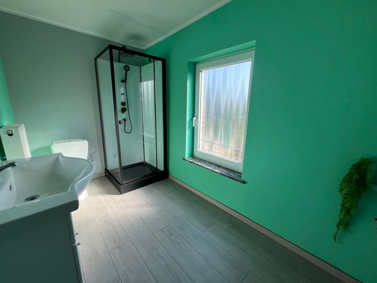 Hall d'entrée, cuisine (frigo/congélateur, évier, hotte, taque vitrocéramique, four), salle à manger, salon, salle de douche (Douche, WC, meuble évier, coin buanderie).