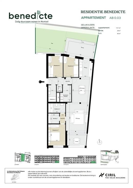 Dit gelijkvloerse appartement is gelegen aan de Sint-Benedictusstraat in Mortsel binnen het energiezuinige nieuwbouwproject Benedicte: een groene thuis voor iedereen die waarde hecht aan duurzaamheid, een natuurlijke omgeving en zalig wooncomfort. Benedicte is een toekomstgericht en duurzaam BEN-woonproject rondom een nieuw groen en autoluwe park in Mortsel. Alle woningen en appartementen halen minstens EPC label A. Bovendien zijn de gebouwen energiepositief: ze verbruiken dus minder energie dan ze produceren. Dit appartement heeft een oppervlakte van 117m², heeft een tuin van 42m² en terrassen van 24m² met zuid oriëntatie, en drie slaapkamers. Bijzonderheden - koolstofneutrale massieve houtbouw (CLT) - energiezuinige BEN-woningen - maximaal behoud van het bestaande groen - gelegen in een autoluw park - 100% hernieuwbare energie - ondergrondse autostaanplaats en kelder bij aan te kopen Ben jij geïnteresseerd in dit nieuwbouw appartement te koop in hartje Mortsel, ben je op zoek naar ander vastgoed of wens je de waarde van jouw eigendom te kennen? Dan ben je bij BOLT immo aan het juiste adres! Wij helpen jou graag verder. Weet dat wij u met plezier helpen voor een vrijblijvende (EN GRATIS!) SCHATTING, mét tips en advies. U kan ons contacteren op het nummer 03 568 68 06 of langskomen in onze kantoren te Wilrijk of Antwerpen.