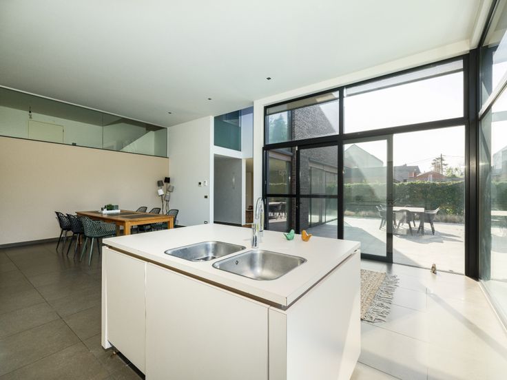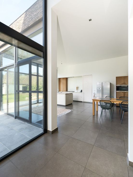 Deze moderne woning met hoge plafonds is geschikt voor een groot gezin al dan niet in combinatie met een zelfstandige activiteit.