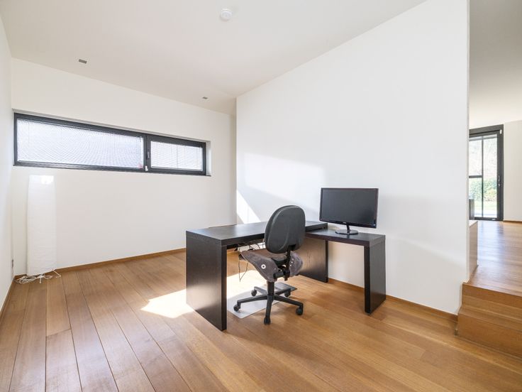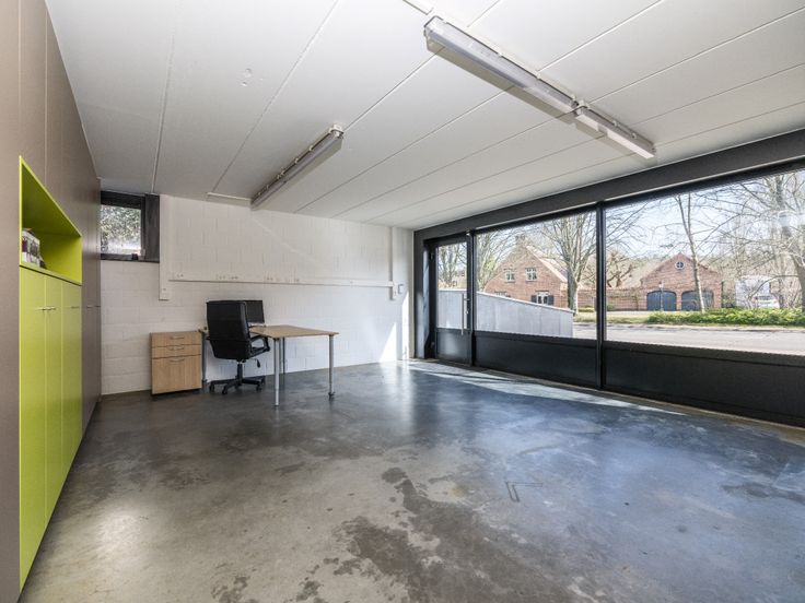 De oorspronkelijke dubbele garage met gepolierde betonplaat is omgevormd tot een bureelruimte. De achterliggende kelders zijn nuttig als stockageruimte.