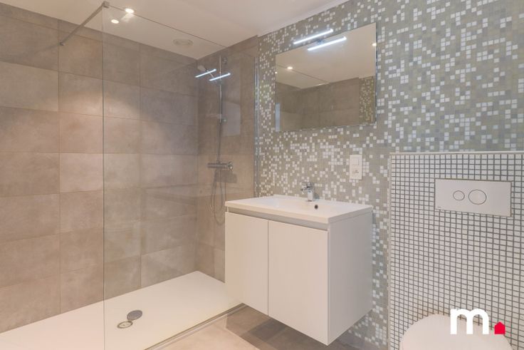 Er is een ruime moderne ingerichte badkamer met toilet, inloopdouche en lavabo met meubel en spiegel.