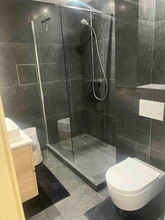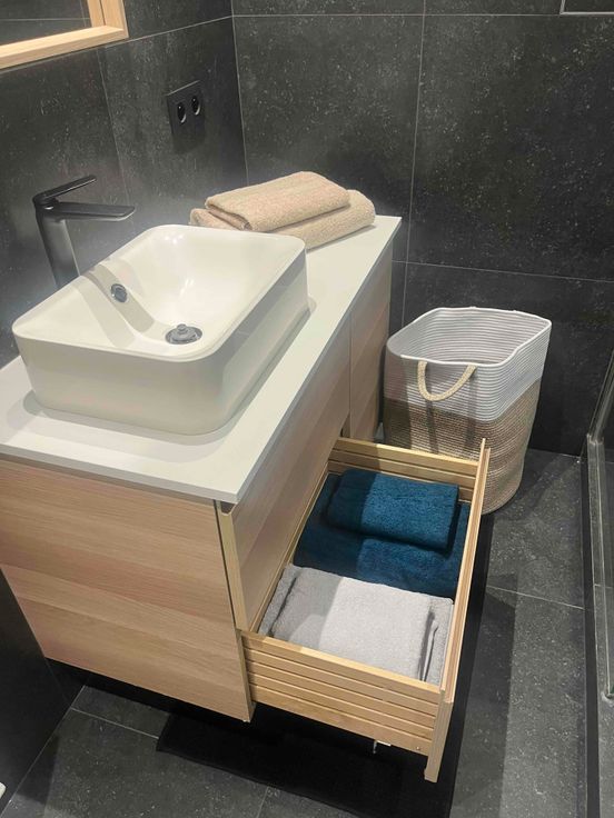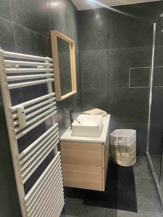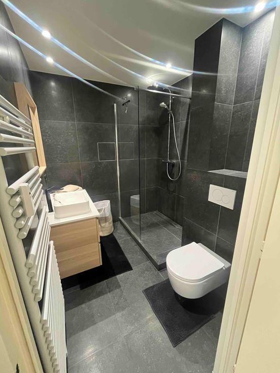 Salle de bain avec douche à l'italienne, meuble lavabo, WC.