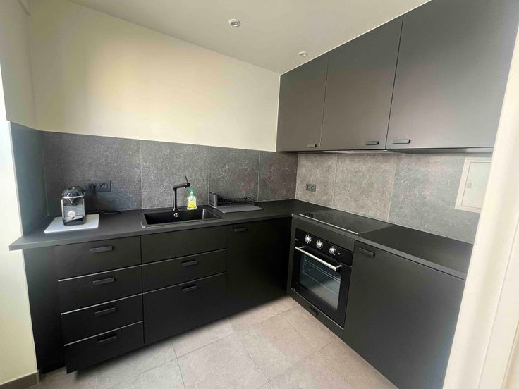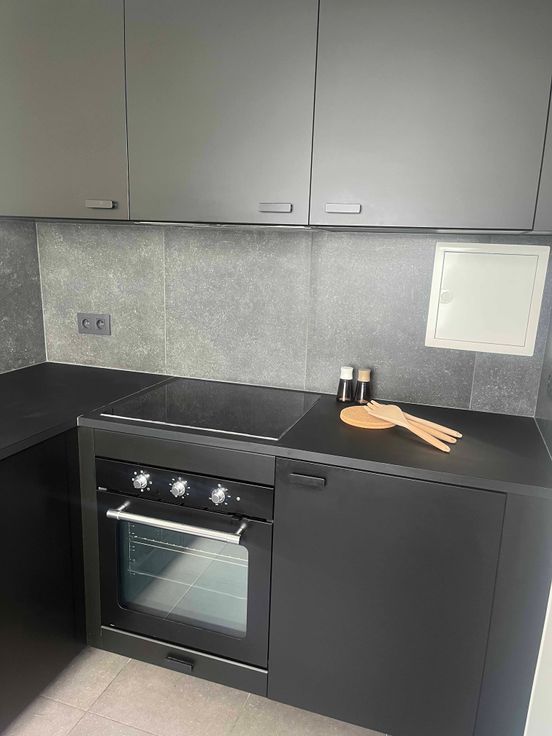 Cuisine hyper-équipée (four, hotte, 4 taques à induction, frigo et mobilier de rangement).