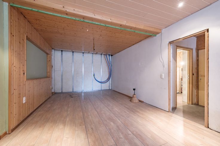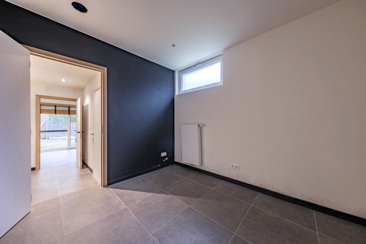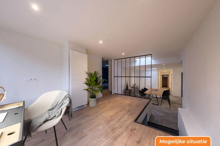 Via de inkomhal komen we in de eerste ruimte een nog af te werken polyvalente ruimte, die ruimte biedt voor een werkplaats of studio. De polyvalente ruimte werd nog niet afgewerkt, dus leent zich ook tot multifunctionele doeleinden. We denken hierbij aan een kantoor of praktijkruimte.
