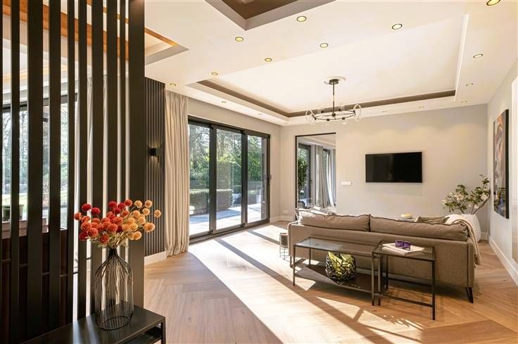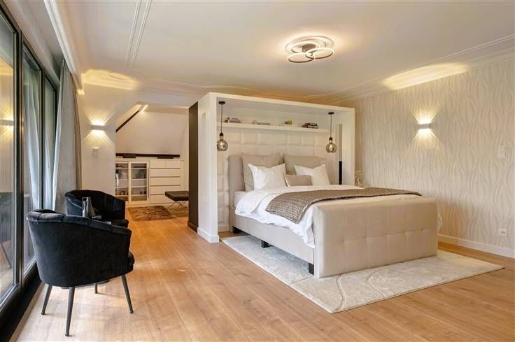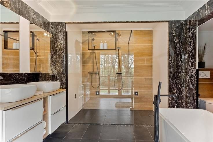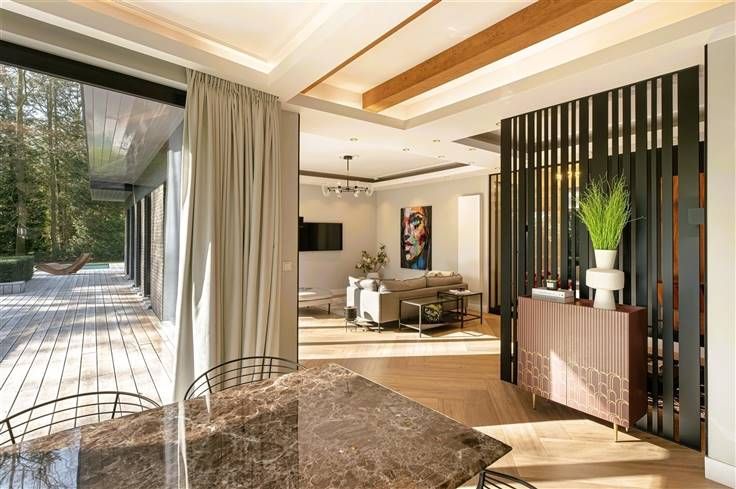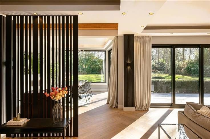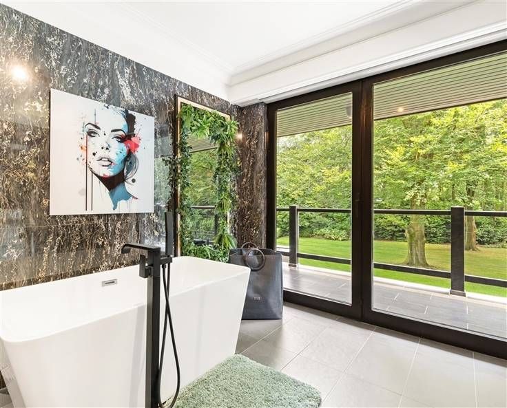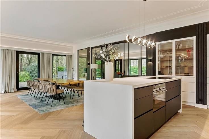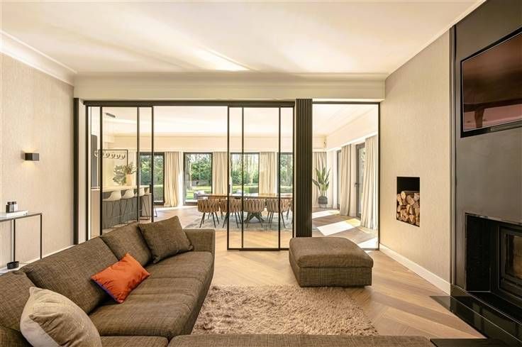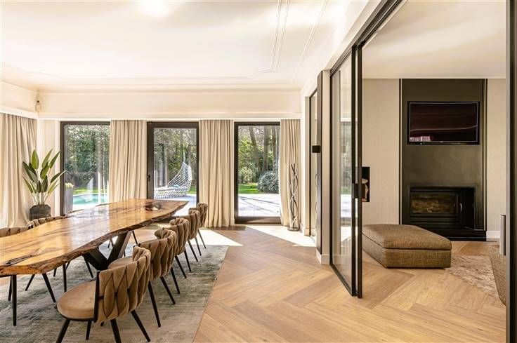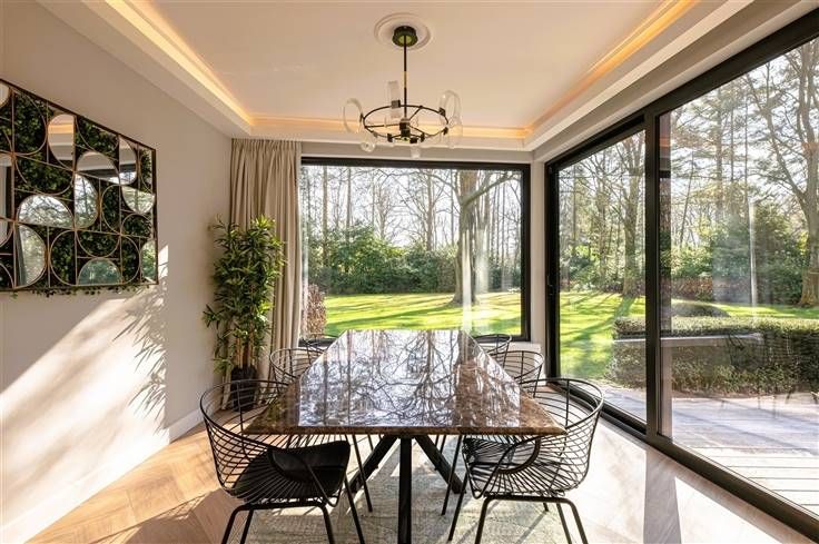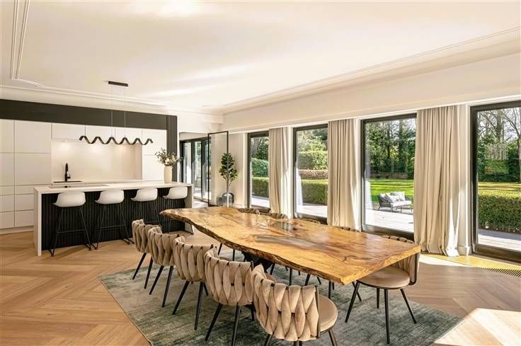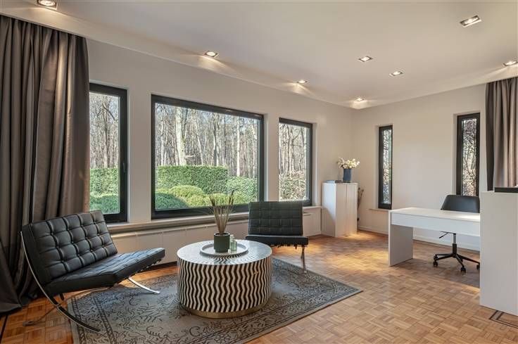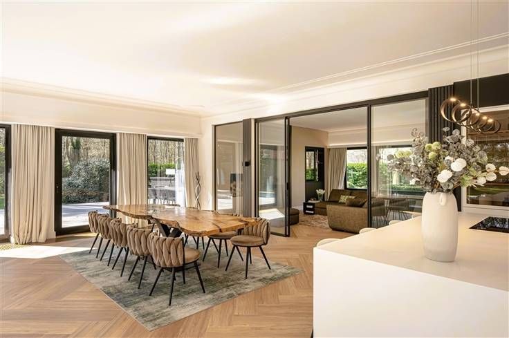 Luxe & privacy op toplocatie in Kapellen met de mogelijkheid tot kangoeroewonen of inwonend personeel. Deze grondig en luxueus gerenoveerde villa op een domein van ca. 2 ha combineert tijdloos design met totale rust, midden in het groen en toch vlak bij het dorpscentrum. De villa verwelkomt je via een imposante marmeren inkomhal met gastentoilet en stijlvolle trappartij. De centrale lounge met tuinkamer verbindt de leefruimtes met de gezellige haardkamer en de open leefkeuken, uitgerust met alle topapparatuur. Verder is er een bureel of gastenkamer met badkamer, een grote bijkeuken en een inpandige garage. Op de verdieping vind je de master met dressing, luxe badkamer en balkon met zicht op de tuin, drie extra slaapkamers, een badkamer en apart toilet. De zolder is volledig afgewerkt; de kelder herbergt o.a. de technische installaties van het verwarmde plungepool. Buiten geniet je van een fraai aangelegde, zonnige tuin met padoek terras, meerdere zithoeken en een sfeervol bijgebouw met 3 garages/stallen en overdekt terras met haard. Troeven: A-label EPC (warmtepomp + biomassa CV + zonnepanelen) Uitgebreide domotica & beveiliging Elektriciteit conform Residentieel & groen gelegen