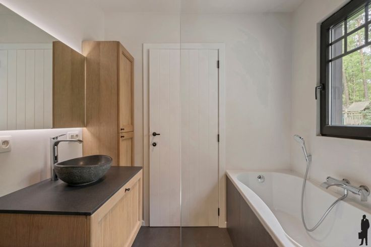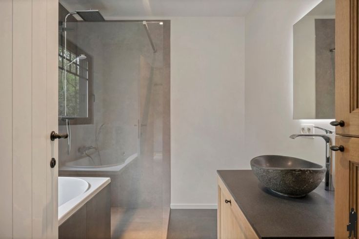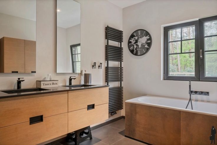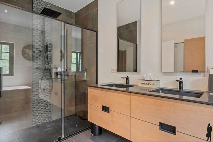 - Een badkamer: ruime inloopdouche, dubbele lavabo, bad, ingemaakt meubel en handdoekverwarmer