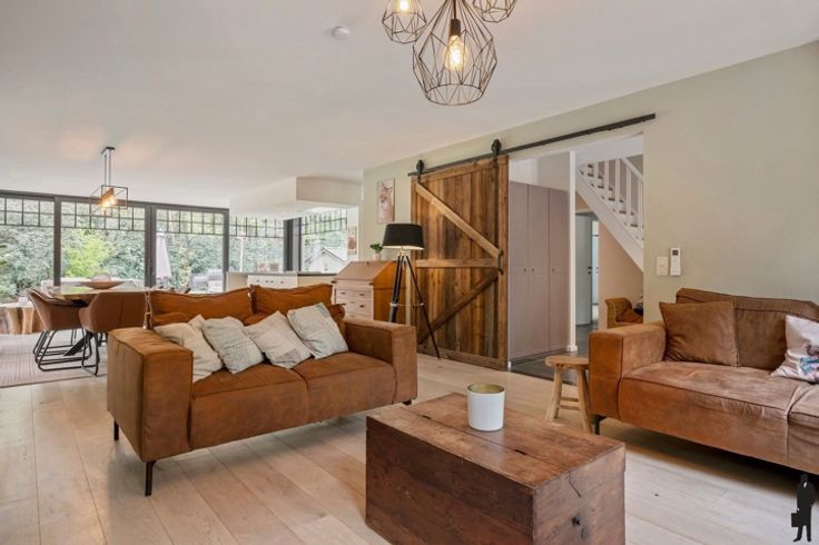 - Een ruime leefruimte op parket met houthaard en schuifdeur naar de tuin