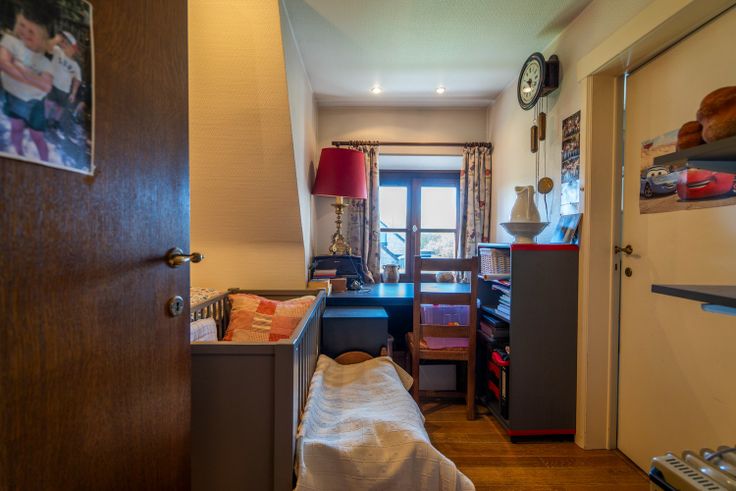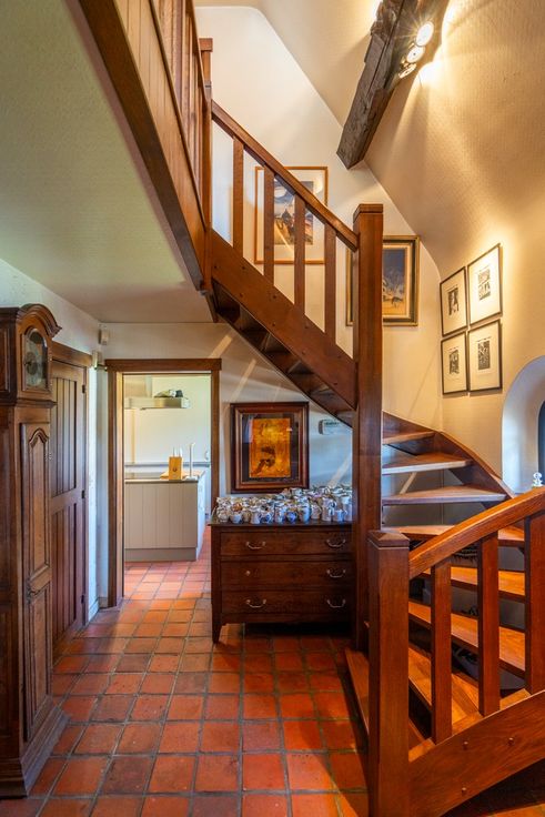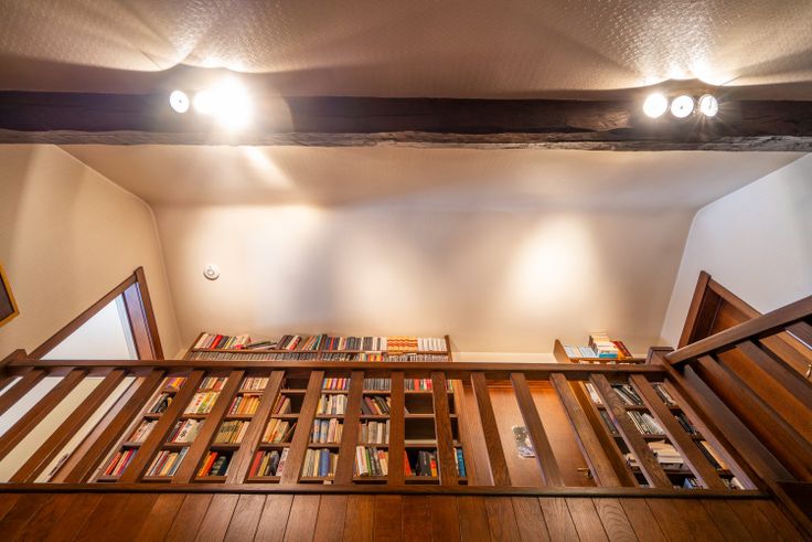 De massieve houten trap in de hal brengt je naar de bovenverdieping, waar een indrukwekkende en authentieke bibliotheek is. De nachthal biedt verder toegang tot twee slaapkamers en de badkamer. Via de derde slaapkamer heeft u doorgang naar een vierde, kleinere slaapkamer. Vanuit de badkamer kom je terecht in de master bedroom.