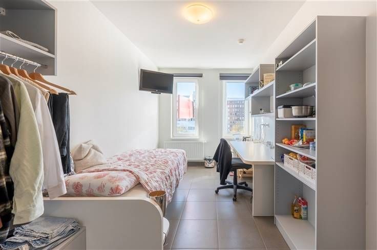 Moderne studentenkamer op toplocatie in Antwerpen! Deze studentenkamer is gelegen op de 4de verdieping van een recent gebouw op de vernieuwde leien in Antwerpen. Op wandelafstand vindt u onder meer de AP Hogeschool, de stadscampus van de Universiteit Antwerpen, het MAS en verschillende winkels en haltes van het openbaar vervoer. De kamer is bemeubeld met een bed, kast, bureau, TV en beschikt over een eigen badkamer met inloopdouche, toilet en lavabo. Er zijn 3 gemeenschappelijke keukens in het gebouw en een ruime fietsenstalling. De kamer is verhuurd tem 31 augustus 2025. In dit gebouw hebben we meer kamers te koop staan.
