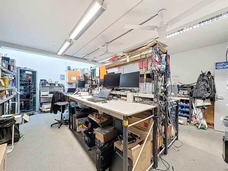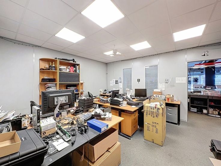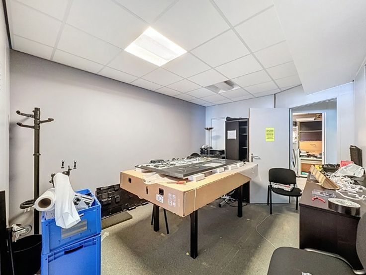 Achteraan bevinden zich aparte ruimtes, waaronder een bureelruimte ideaal voor administratie, en een opslagruimte die perfect is voor voorraadbeheer of logistieke ondersteuning.