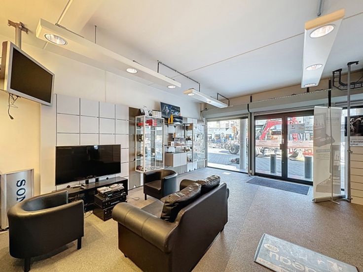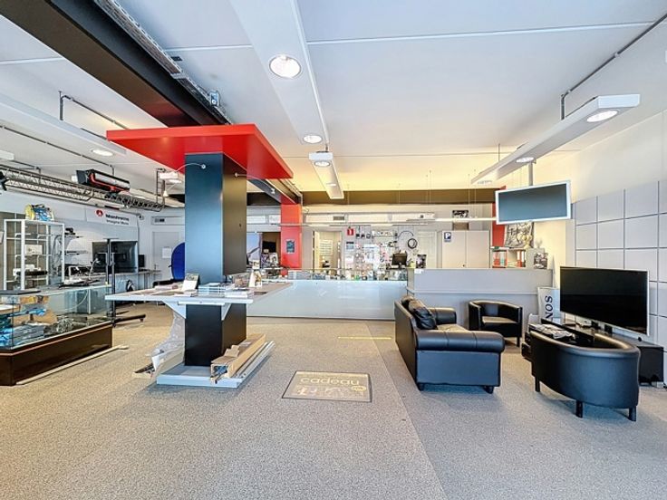 Het pand beschikt over een praktische en doordachte indeling. Klanten of cliënten worden ontvangen in een ruime entreehal, die leidt naar een royaal winkel- of showroomgedeelte dat zich leent voor uiteenlopende commerciële doeleinden: retail, kantoor, praktijkruimte of dienstverlening.