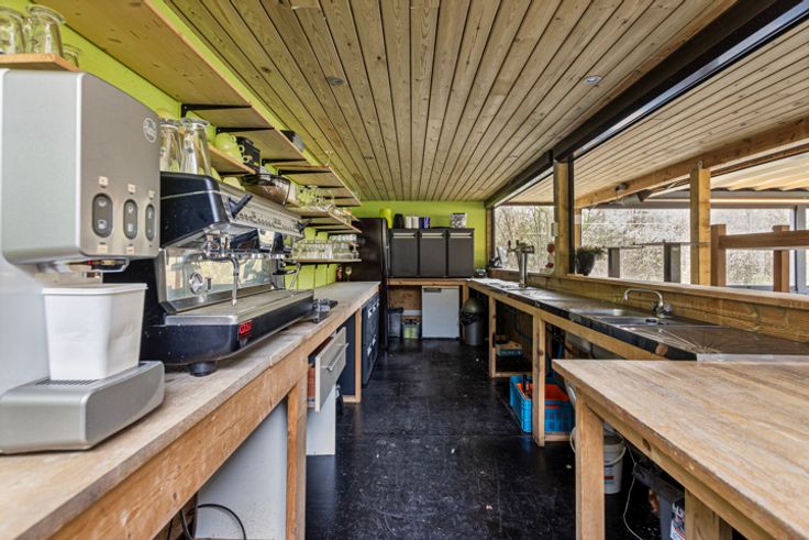 Op het gelijkvloers bevindt zich een gedeelde inkom, verbruikerszaal, keuken en sanitair en achteraan een buitenbar met terras. Dit alles in een groene omgeving voorzien van een vijver.