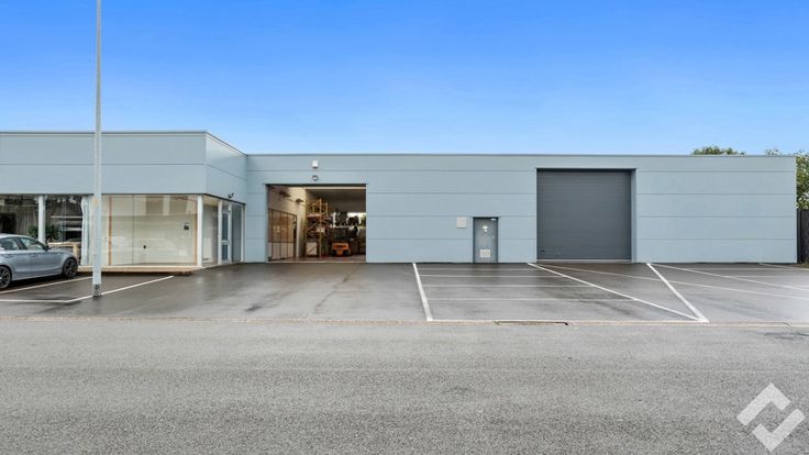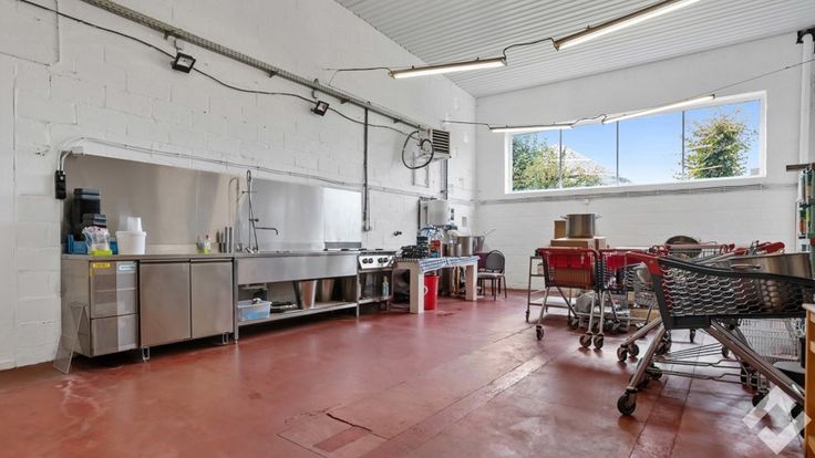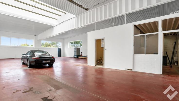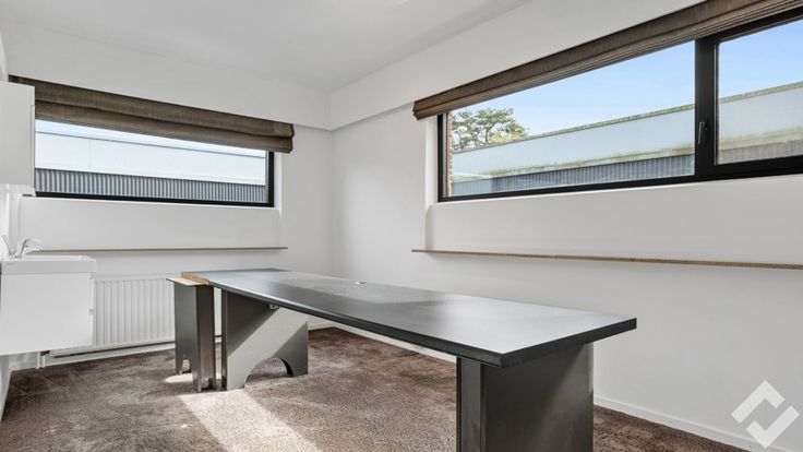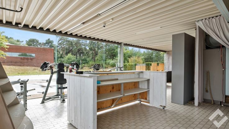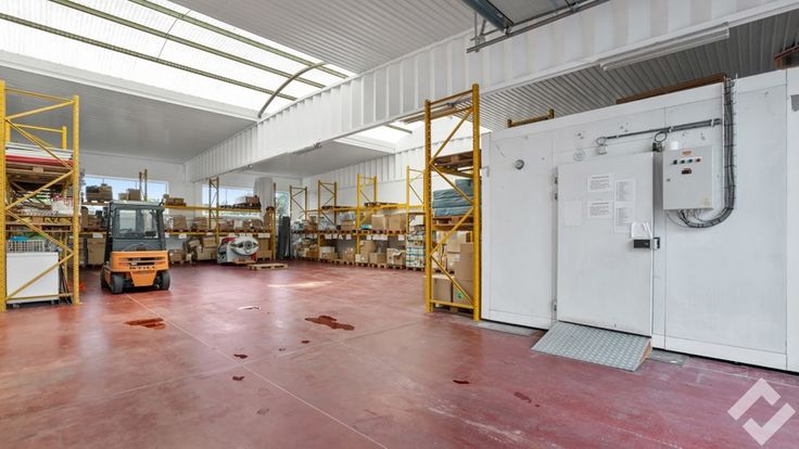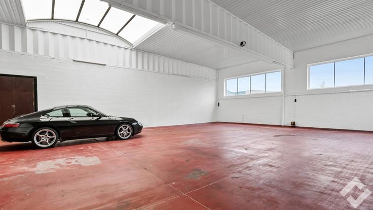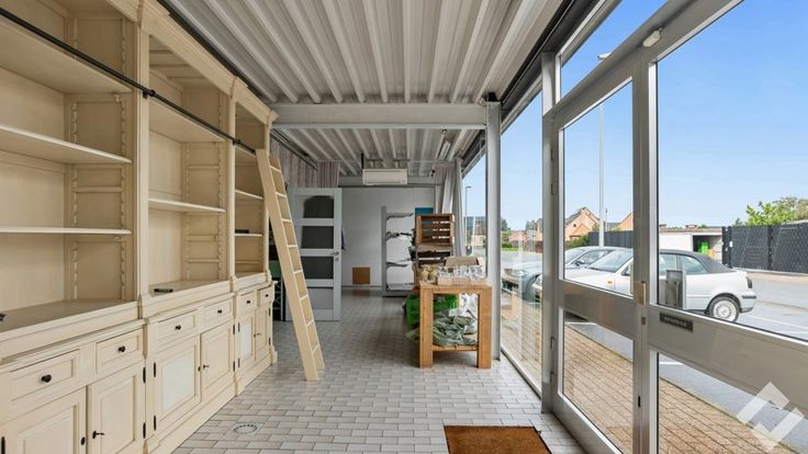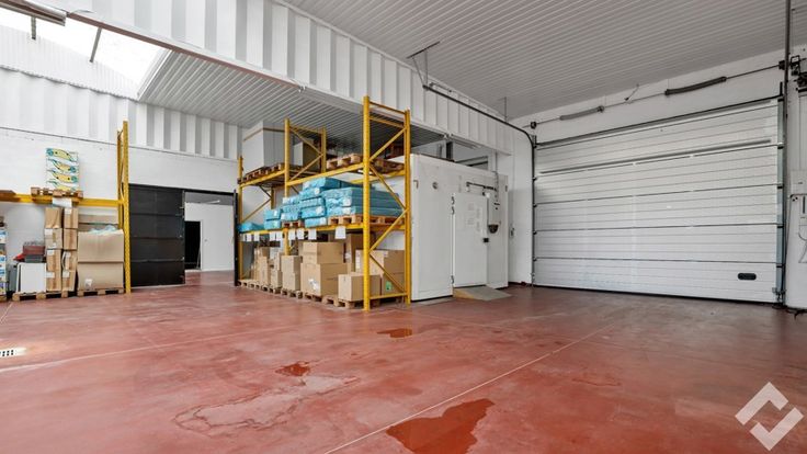 Achteraan vinden we de opslag/werkplaats terug (490m2). Deze heeft voorzieningen zoals een polybetonvloer, twee automatische sectionaalpoorten, stroompunten en drijfkracht, li