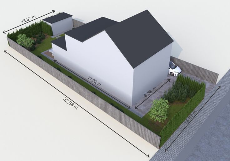 De bouwbreedte bedraagt 8,88m en de bouwdiepte 17m. De totale bouwoppervlakte is 160m².