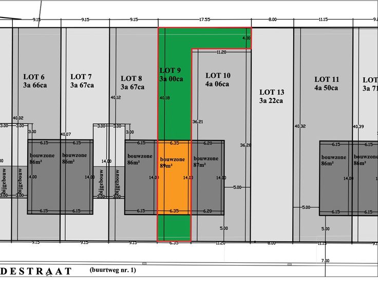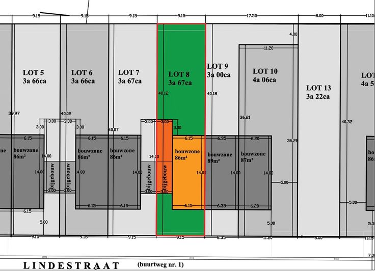 •Lot 9, gesloten bebouwing, is 300m² groot met een straatbreedte van 6,35 meter en een bouwbreedte van 6,35 meter.