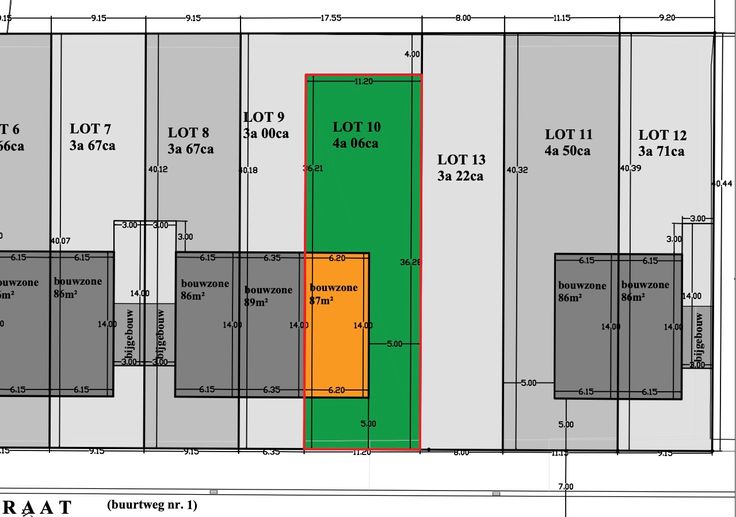 •Lot 10, halfopen bebouwing, is 406m² groot met een straatbreedte van 11,20 meter en een bouwbreedte van 6,20 meter.