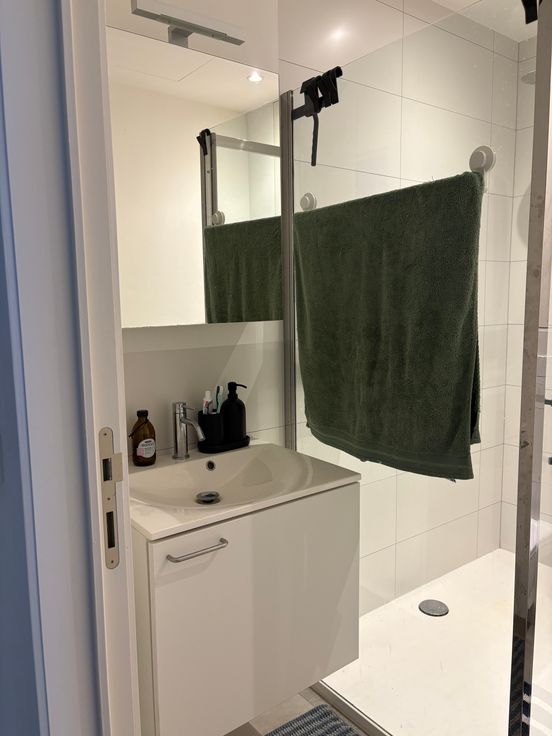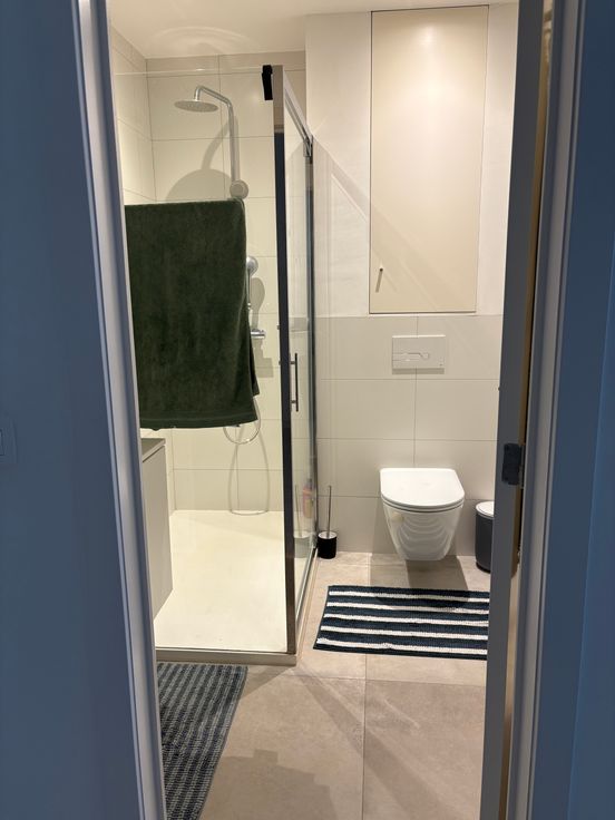 Verder hebben we een badkamer met grote inloopdouche en badmeubel. Zowel in de keuken als badkamer liggen dezelfde waterbestendige tegels.