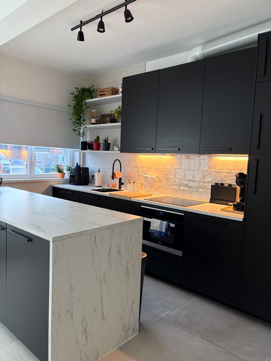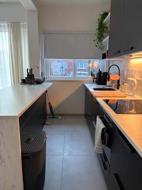 We lopen verder naar de woonkamer/eetkamer. Aansluitend hebben we een open keuken die volledig geïnstalleerd is. De keuken is nieuw geplaatst in 2024 met een ingebouwde vaatwasser, oven/microgolf, inductievuur en ijskast. De verluchting boven de kasten zal nog afgewerkt worden met zwarte panelen.