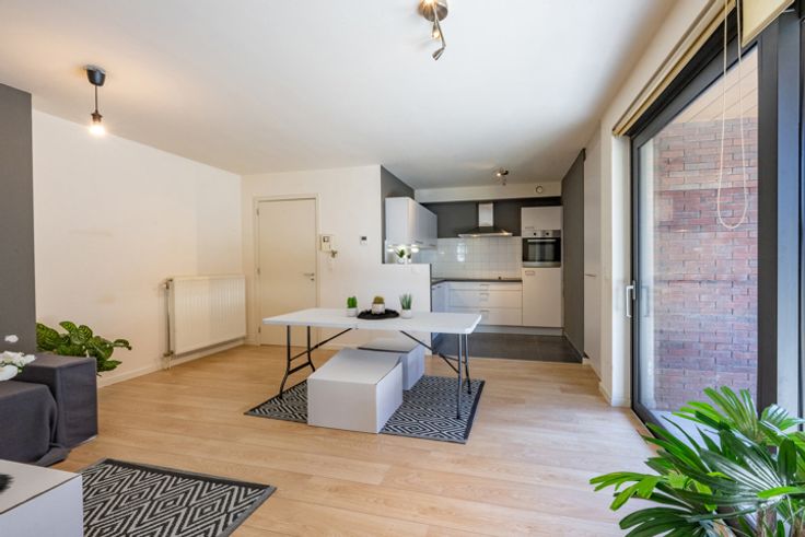 In de Transvaalstraat, gelegen aan de rand van het centrum van Lier, kan je dit gelijkvloerse appartement vinden. De volledige residentie, waaronder tevens dit gelijkvloers appartement, is rolstoelvriendelijk ingericht. De lift, de ondergrondse parkeergarage en de gemeenschappelijke fietsenstalling zorgen voor extra comfort. INDELING: Het appartement heeft een oppervlakte van 80m² en is voorzien van een kwalitatieve vloerbekleding. In de inkomhal is er plaats voor een ruime vestiairekast. De keuken is geïntegreerd in de open leefruimte en is volledig geïnstalleerd. Via de schuifraam kan u naar het privatieve terras. Het appartement heeft twee slaapkamers. Vanuit de beide kamers is er toegang tot de badkamer. Deze badkamer is uitgerust met douche, wastafel en toilet. Verder beschikt het appartement over een afzonderlijk gastentoilet en een bergplaats waar de aansluitingen voor wasmachine en droogkast zijn. De ondergrondse autostaanplaats is in de prijs inbegrepen en u kan eveneens gebruik maken van de gemeenschappelijke fietsenberging. Deze bevinden zich beiden in de kelderverdieping en zijn bereikbaar met de lift. Dit appartement is interessant voor eigen bewoning maar eveneens als investering.