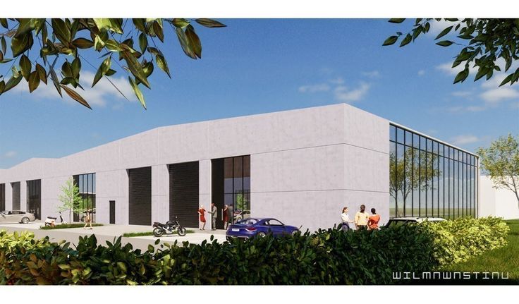 Specificaties: beton- en staalstructuur, gevel in architectonisch beton en aluminium sandwichpanelen, 6m vrije hoogte, volledige overspanning, 1 automatische sectionale poort 4m (b) x 5m (h), aluminium schrijnwerk, geïsoleerd steeldeck dak met centrale lichtstraat, polybetonvloer met draagkracht 2,5t/m², afvoer sanitair, wateraansluiting, 1 septische put en regenwaterput per 2 units, brandalarm en rookluiken, publiciteitspaneel 1,2m x 4m voorzien, fietsenberging en parking 1/100m² ppl (<650m²) en 8 ppl ( >650m² )