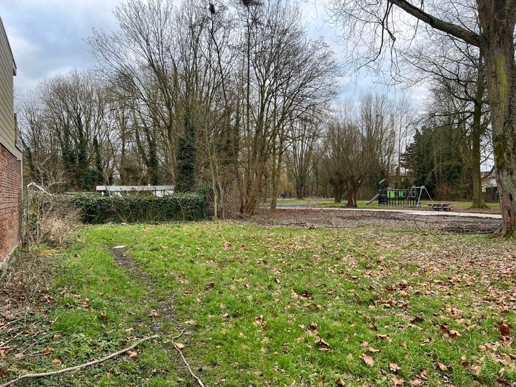 Achter de woning ligt een groenzone met een park