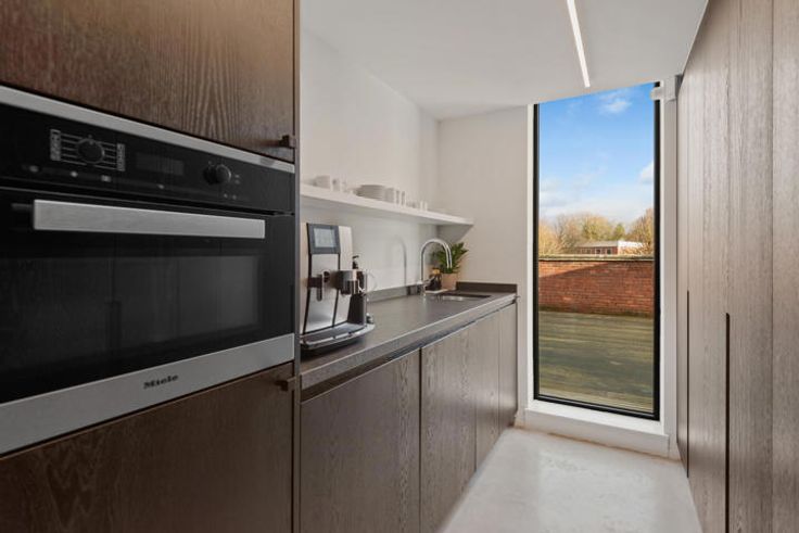 Mooie afgewerkte keuken 8 m² in donker bruin hout met Miele toestellen oven, koelkast, afwasmachine, en lavabo.