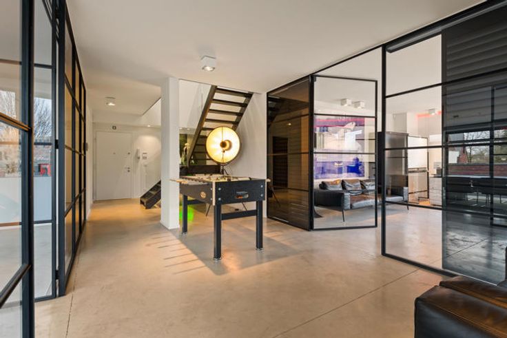 Inkom/ontvangstruimte 35 m² op gepolierde beton met een mooie open trap naar de tweede verdieping.