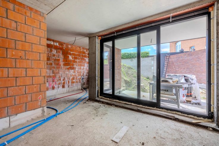 Indeling GLV: inkom met mogelijkheid tot vestiaire en een gastentoilet; gezellige woonkamer met zicht op de tuin en open geïnstalleerde keuken met naastliggend technische berging (warmtepomp, aansluiting WM/DK) en aangelegd terras.