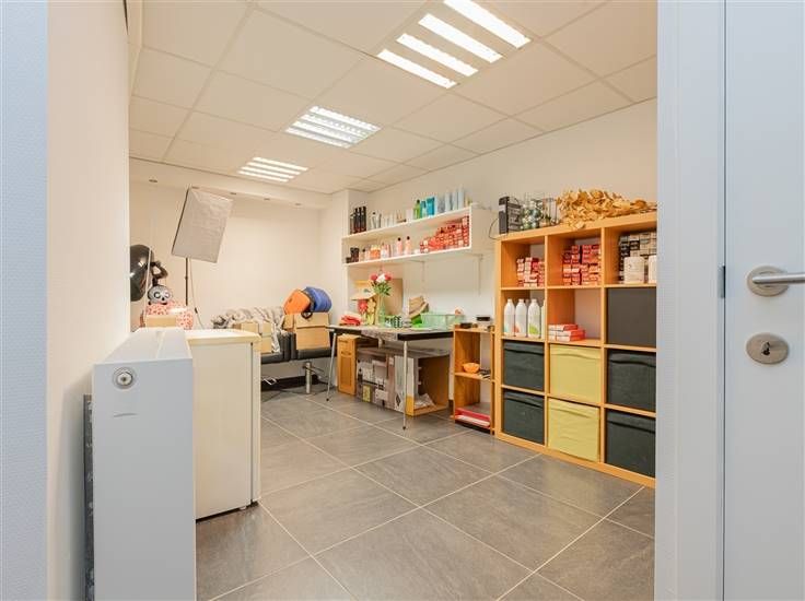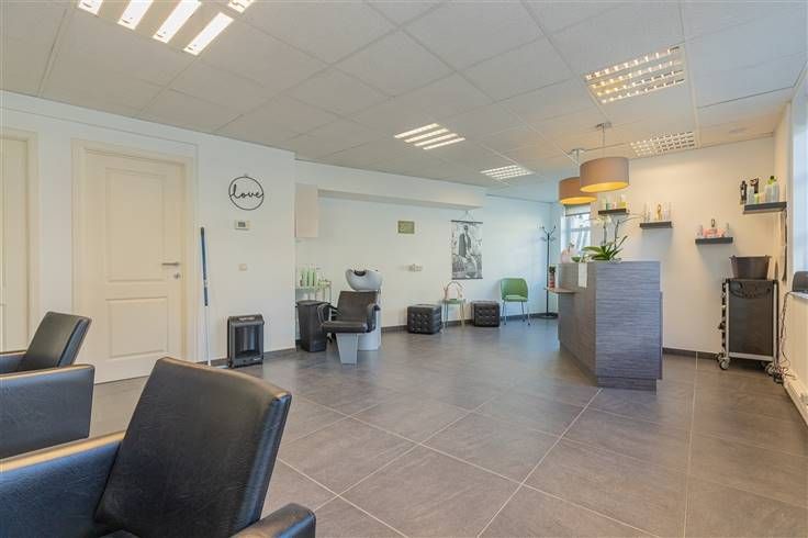 Het pand werd gerenoveerd in 2008 en beschikt over een uitstekende EPC-score (label B). Momenteel is hier een kapsalon gevestigd, maar de ruimte biedt tal van mogelijkheden. De indeling omvat een inkomhal, bureelruimte (nu kapsalon), keuken met toilet, extra bureelruimte (bergruimte) en een garage.
