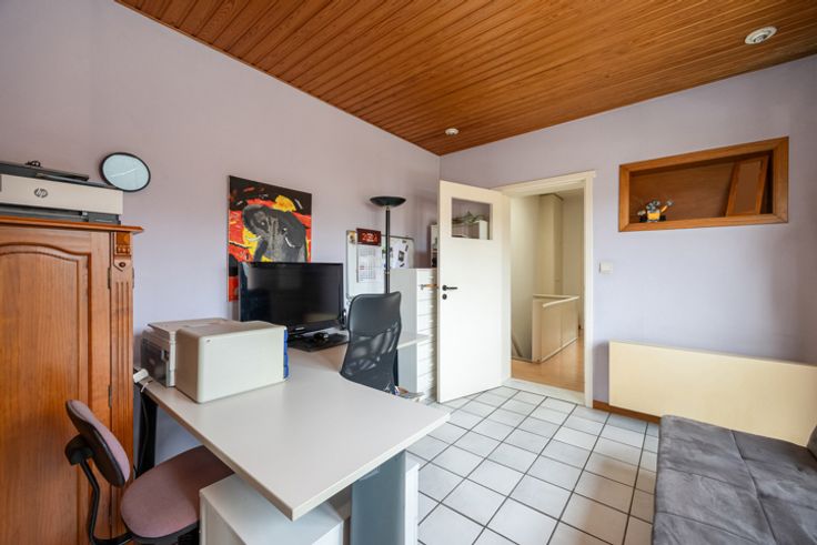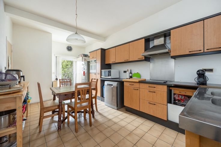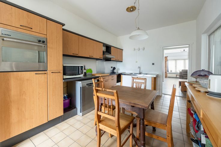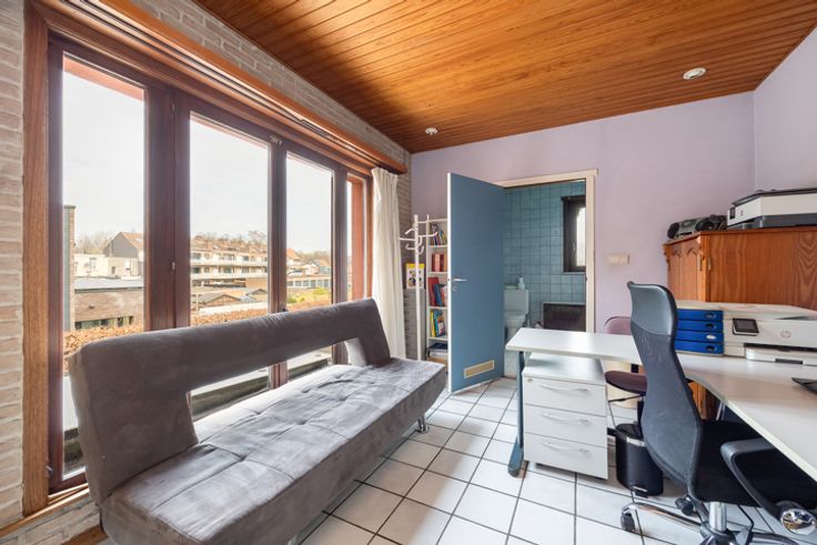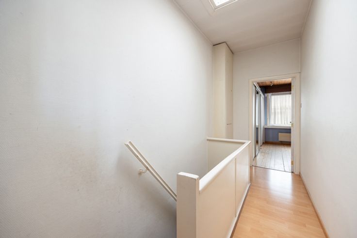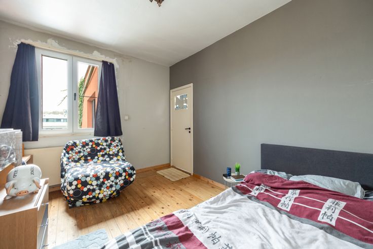 Op te frissen eengezinswoning met 2 à 3 slaapkamers en diepe tuin Centraal gelegen in een rustige eenrichtingsstraat, nabij het Albertkanaal en het gemeentepark, vindt u deze op te frissen woning, die al gedeeltelijk energetisch gerenoveerd werd. Indeling: Inkomhal met tegelvloer, die toegang biedt tot de lichtrijke woonkamer (32 m²) voorzien van een ingemaakte kast en de mogelijkheid voor een open haard. Aansluitend bevindt zich de ruime leefkeuken (18 m²) met toegang tot het terras en de tuin. De keuken is uitgerust met een heteluchtoven, elektrische kookplaat, dampkap, dubbele spoelbak, losstaande vaatwasser en een koelkast met vriezer. Naast de keuken is er een berging/wasplaats en een gastentoilet. De volledig omheinde en diepe tuin biedt volop mogelijkheden en kan nog geheel naar eigen smaak worden aangelegd. Op de eerste verdieping bevinden zich 2 slaapkamers (19,56m², voorzien van een elektrische rolluik en 12,47m²) met planchervloer, evenals een doorloopkamer van 12m² met tegelvloer die perfect als bureau of extra slaapkamer kan dienen. Achter de doorloopkamer ligt de badkamer, uitgerust met een ligbad met geïntegreerde douche, toilet en twee lavabo's. Gelegen vlakbij openbaar vervoer, het centrum van Schoten, scholen, winkels en diverse invalswegen. Extra: * PVC ramen 2024 (80%) * Dak 2015 + isolatie 12cm * Gedeeltijk geïsoleerde gevels 12cm * CV op gas 2008 * Ruime kelder * Asbestveilig