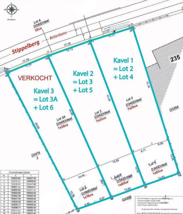 Twee ruime bouwgronden voor open bebouwing. Beide gronden zijn zuidgericht. Kavel 1: lot 2 + 4: Bouwgrond met een oppervlakte van 9a 13ca en een straatbreedte van 17,11m, gekadastreerd sectie D, nrs 340EP0000 en 340HP0000. kavel 2: lot 3 + 5: Bouwgrond met een oppervlakte van 9a 18ca en een straatbreedte van 17,12m, gekadastreerd sectie D, nrs 340FP0000 en 340KP0000. van toepassing op beide loten: vergunning gereikt: 1976: verkaveling; 2019: wijziging verkaveling; 2019: ontbossing – gelegen in woongebieden met landelijk karakter en achteraan in agrarisch gebied – voorkooprecht: de Vlaamse Waterweg – geen erfgoed – watertoets: P-Score: A; geen risicozone voor overstromingen – geen WORG – gelegen in het gemeentelijk rooilijnplan: Stippelberg lot: 195.000 euro. Verdere documentatie te verkrijgen via het kantoor. P score: A