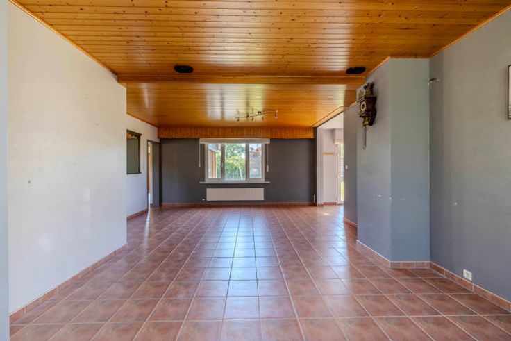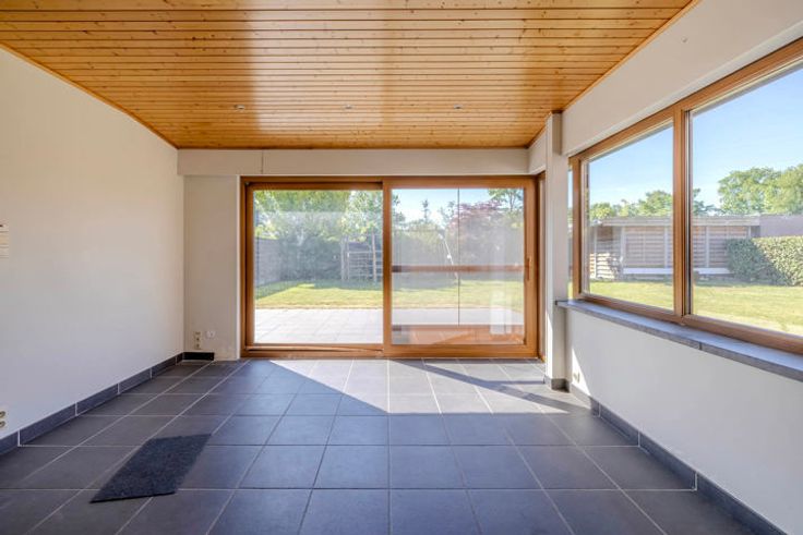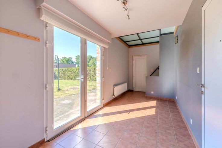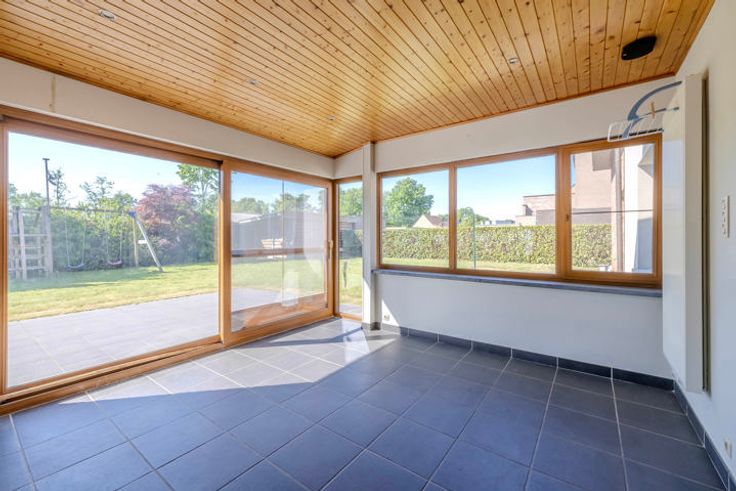 Indeling GLV: inkomhal; toilet; woonkamer met zicht op de tuin; geïnstalleerde keuken voorzien van de nodige toestellen (+ Amerikaanse koelkast); aanpalende berging / wasplaats; lichtrijke veranda met toegang naar het terras; inpandige garage met automatische poort; zijdeur met 2e trap naar de 1V.