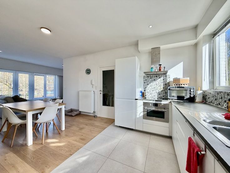Ruime living met veel lichtinval en een open keuken met inductie kookplaat, nieuwe dampkap, ingebouwde ijskast en diepvries, warme lucht oven en een vaatwasser.