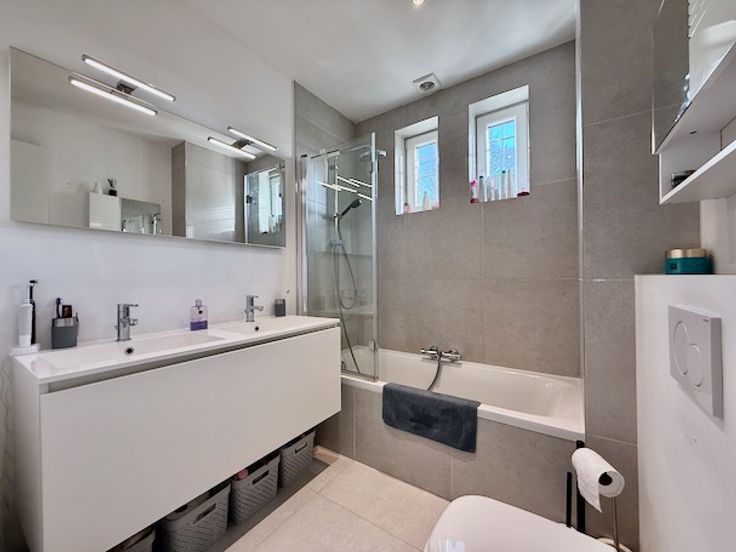Op de 1e verdieping bevindt er zich de badkamer met bad/douche combinatie, dubbele lavabo en een toilet.