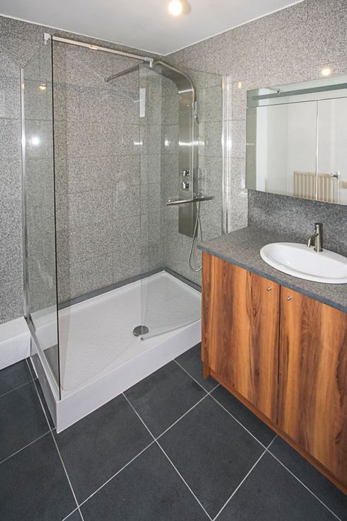 Vloer is volledig in natuursteen als ook de keuken en badkamer.