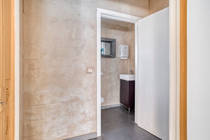 Achter de voorste ruimte bevindt zich een l-vormige plaats waar er nog een keuken- en afwasgedeelte is. Van hieruit is er eveneens toegang tot de koer. Verder is er nog een apart toilet en een badkamer met lavabo en douche.